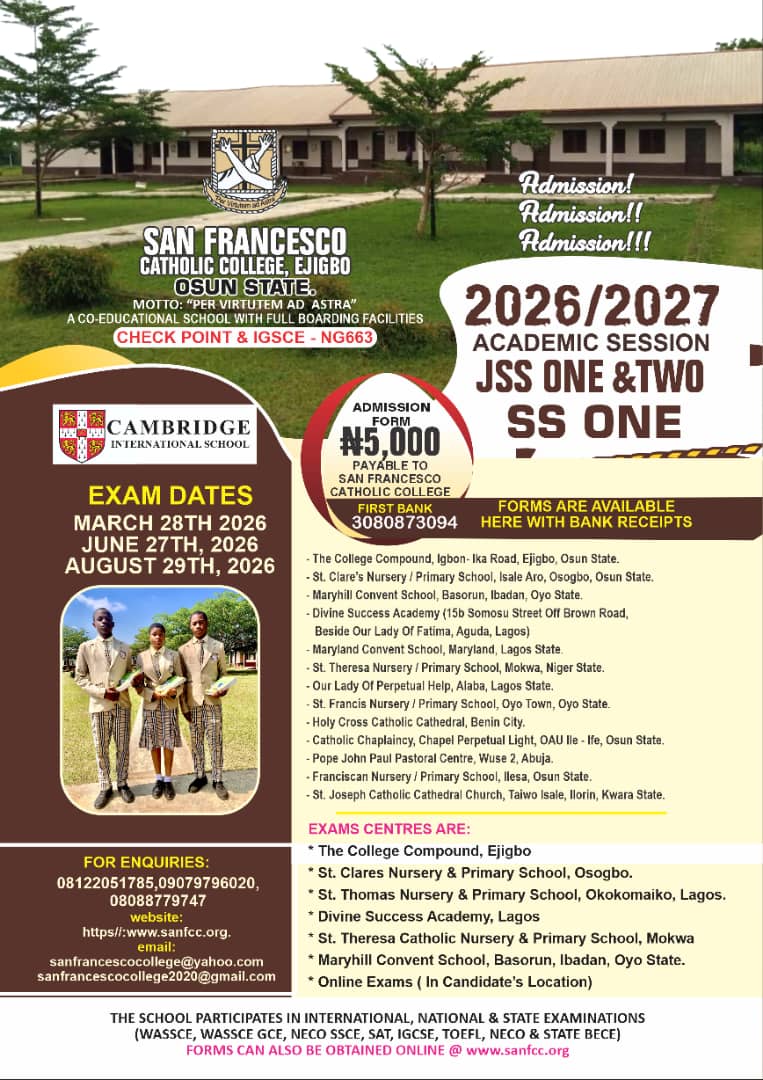 San Francesco Catholic College lgbon/lka Road, Ejigbo, Osun State. P.O. BOX 121.
